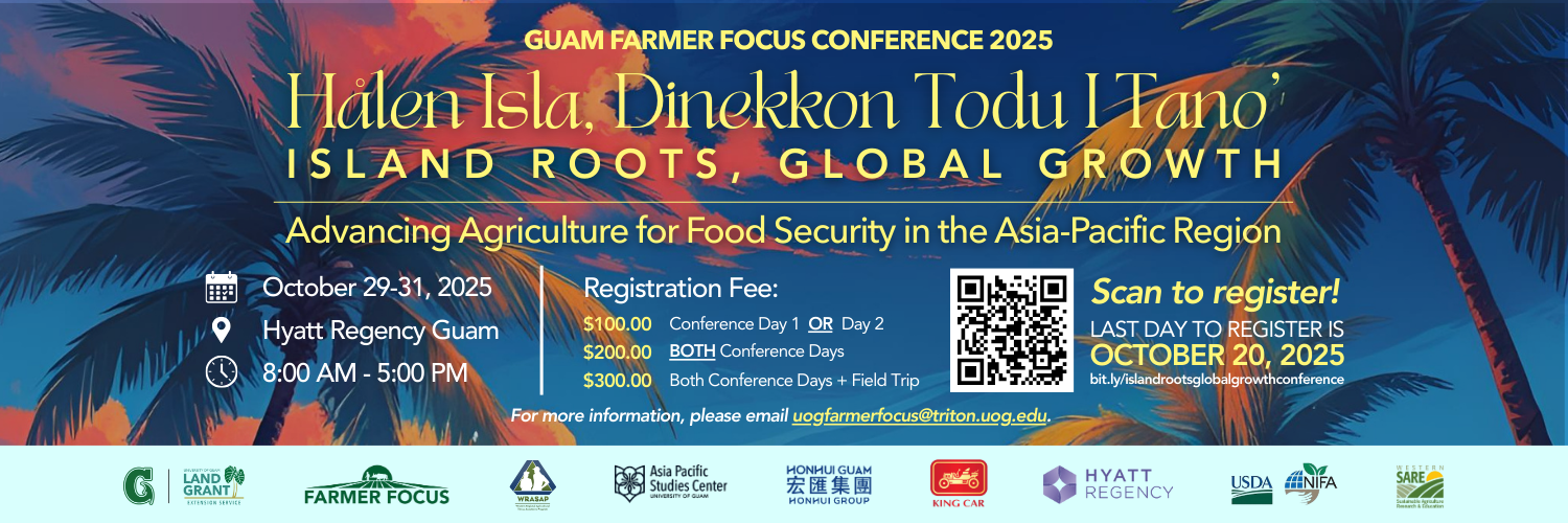 The Guam 2025 Farmer Focus Conference is rooted in local and regional growth, particularly in the agribusiness and tourism industries. Centered around the theme of “Hålen Isla, Dinekkon Todu I Tano (Island Roots, Global Growth),” conference activities and presentations are designed to bridge the island’s culture with global strategies and industries to foster innovative development and transcultural collaboration. This event consists of two full days of panel sessions, breakout sessions, poster presentations, and outreach booths by project partners. Additional conference activities are also available but are optional, such as a field-trip day and cultural immersion events. For more information, interested individuals may email uogfarmerfocus@triton.uog.edu.