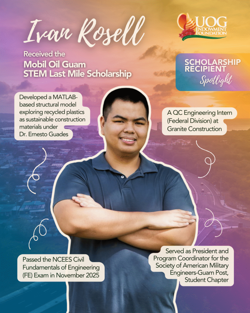 Ivan is a senior civil engineering student at the University of Guam whose time at UOG has been defined by research, leadership, and service. He has contributed to multiple NASA and NSF/NSA-funded research projects, including MATLAB-based modeling of recycled plastic–modified concrete under the mentorship of Dr. Ernesto Guades. In addition, Ivan has served as a teaching assistant and math tutor, supporting fellow students in math and civil engineering courses.